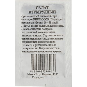 Среднеспелый (период от массовых всходов до начала технической спелости 50-60 дней) сорт листового салата. Растение среднерослое, розетка листьев полуприподнятая. Лист темно-зеленый, глянцевый, среднепузырчатый, волнистость края слабая, поверхность листа ровная, мякоть маслянистая. Масса розетки 55-65 г. Вкус отличный. Ценность сорта: длительное сохранение хозяйственной годности, устойчивость к стеблеванию, отличные вкусовые качества. Товарная урожайность 2,4-2,8 кг/м2.